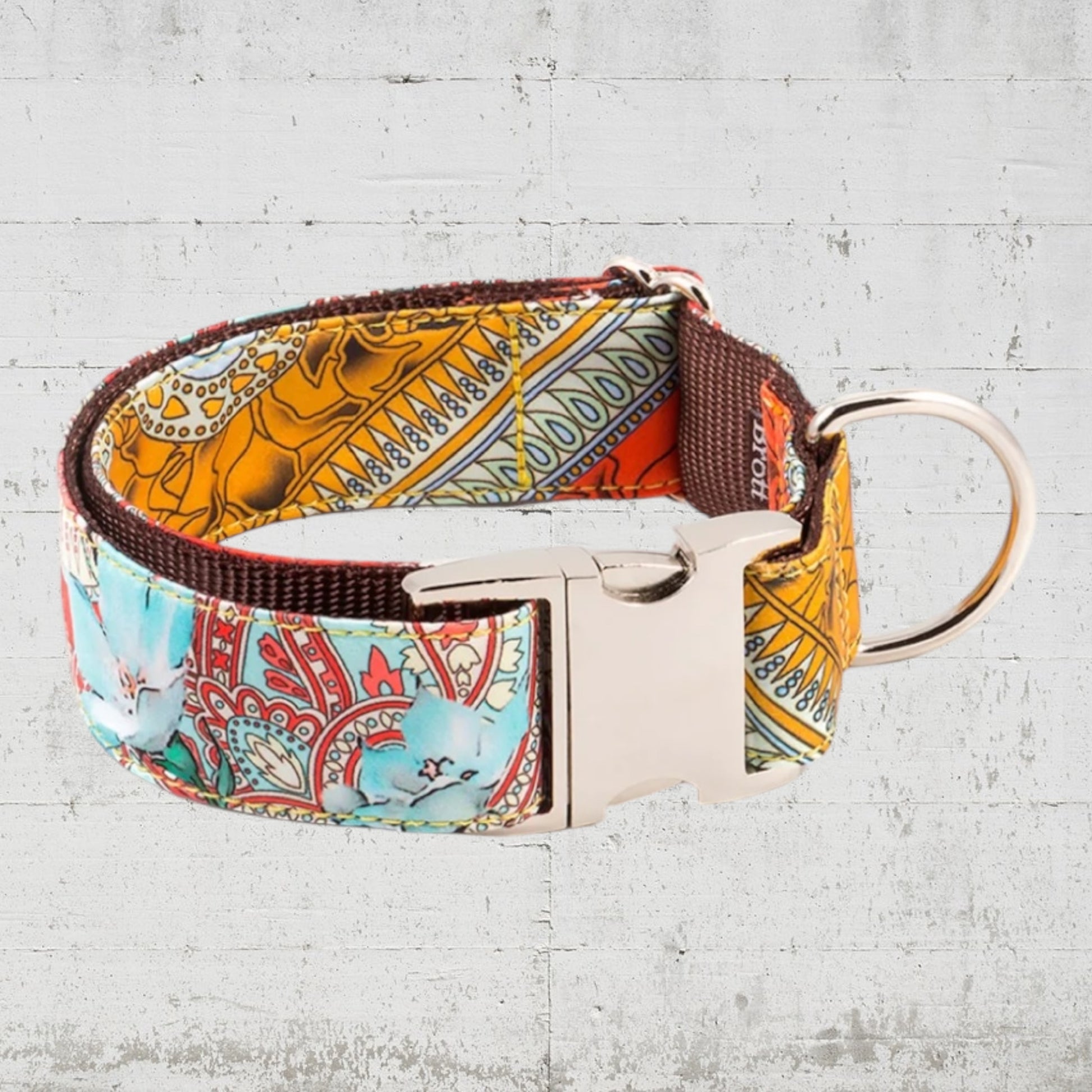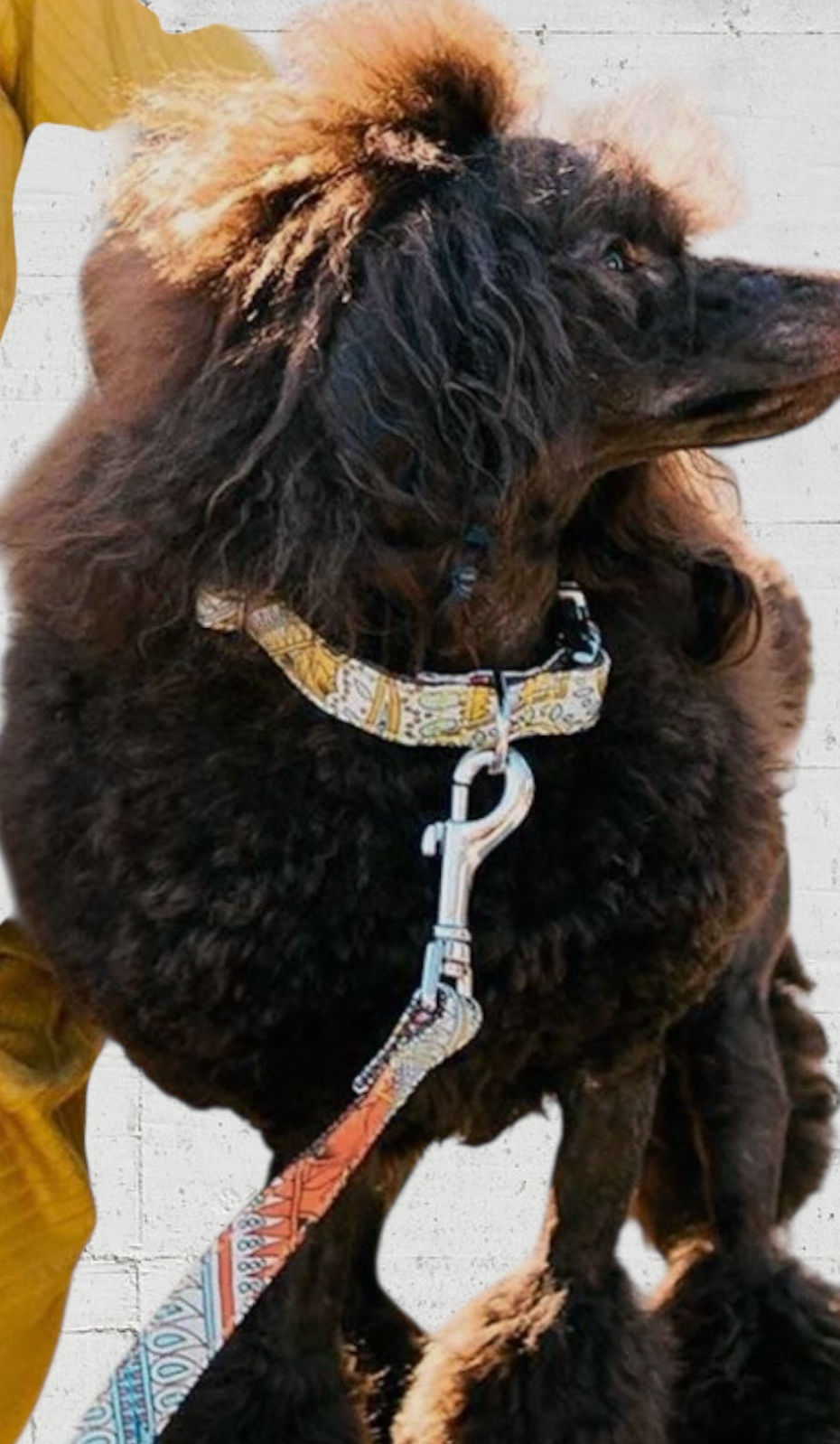 エレガントさと大胆さを兼ね備えた、鮮やかなスペインらしいデザインが魅力のSacaleta首輪。抽象的なフォルムとカラフルな色彩が、太陽が輝く夏の雰囲気を存分に表現しています。この首輪をつけた愛犬とのお散歩は、まるでスペイン地中海のリゾートを訪れたかのような気分に?どんな毛色のワンちゃんにも映えるデザインです。