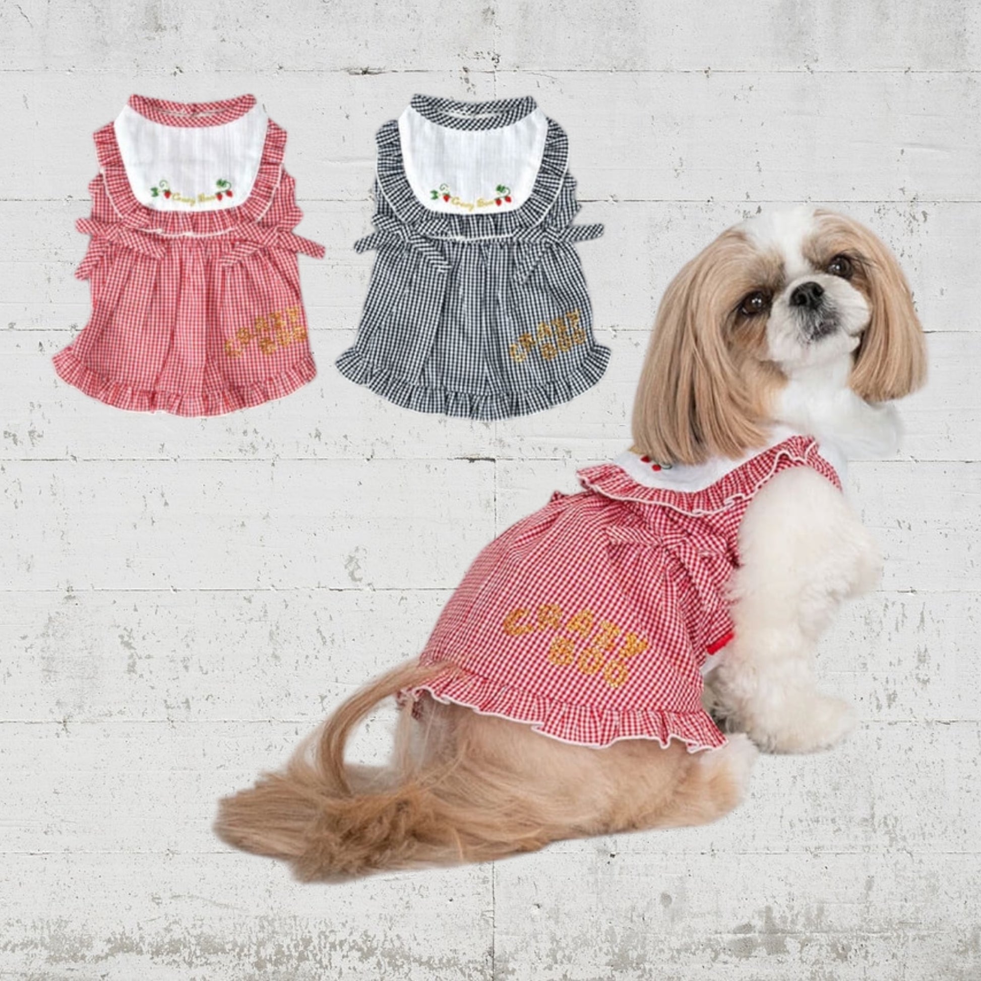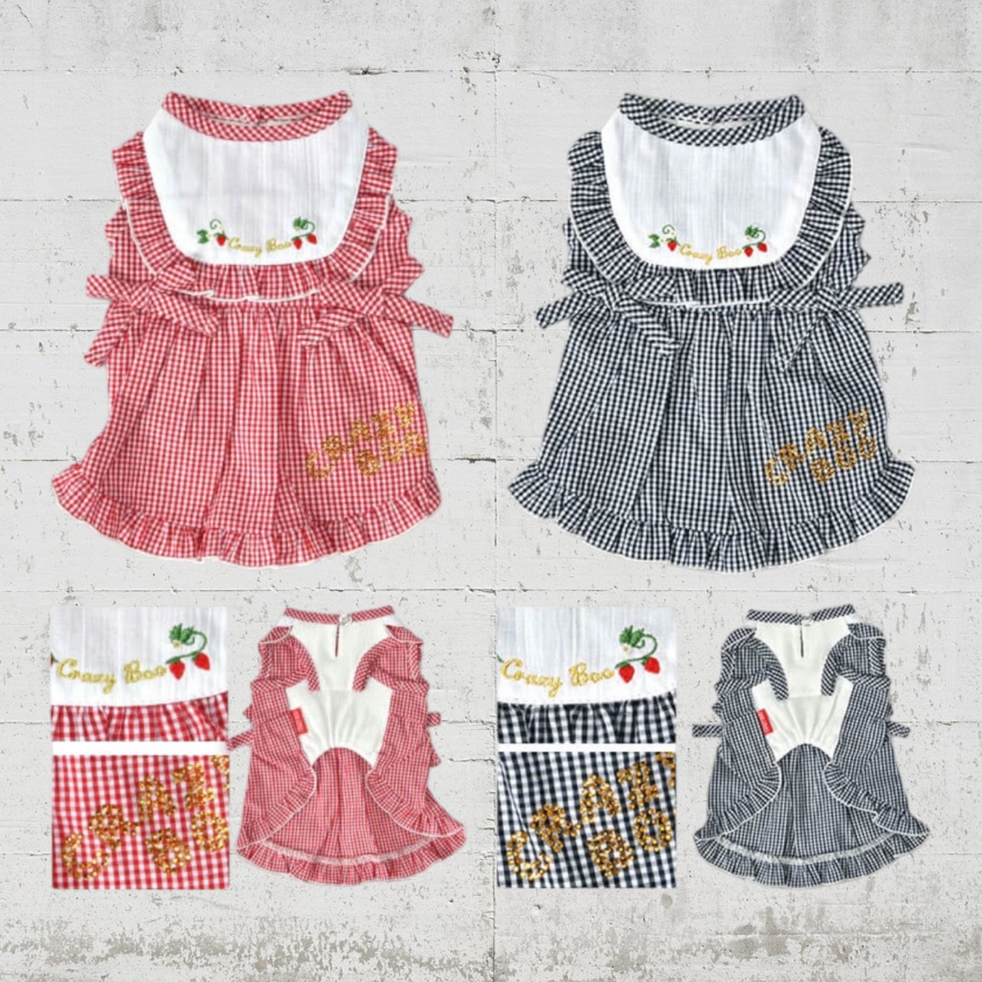 ギンガムチェック柄のワンピース。いちごの刺繍付き。フロントには大きなリボンでさらにかわいさアップ。ラインストーンのブランドロゴもキラキラしていて一気に華やかです✨
