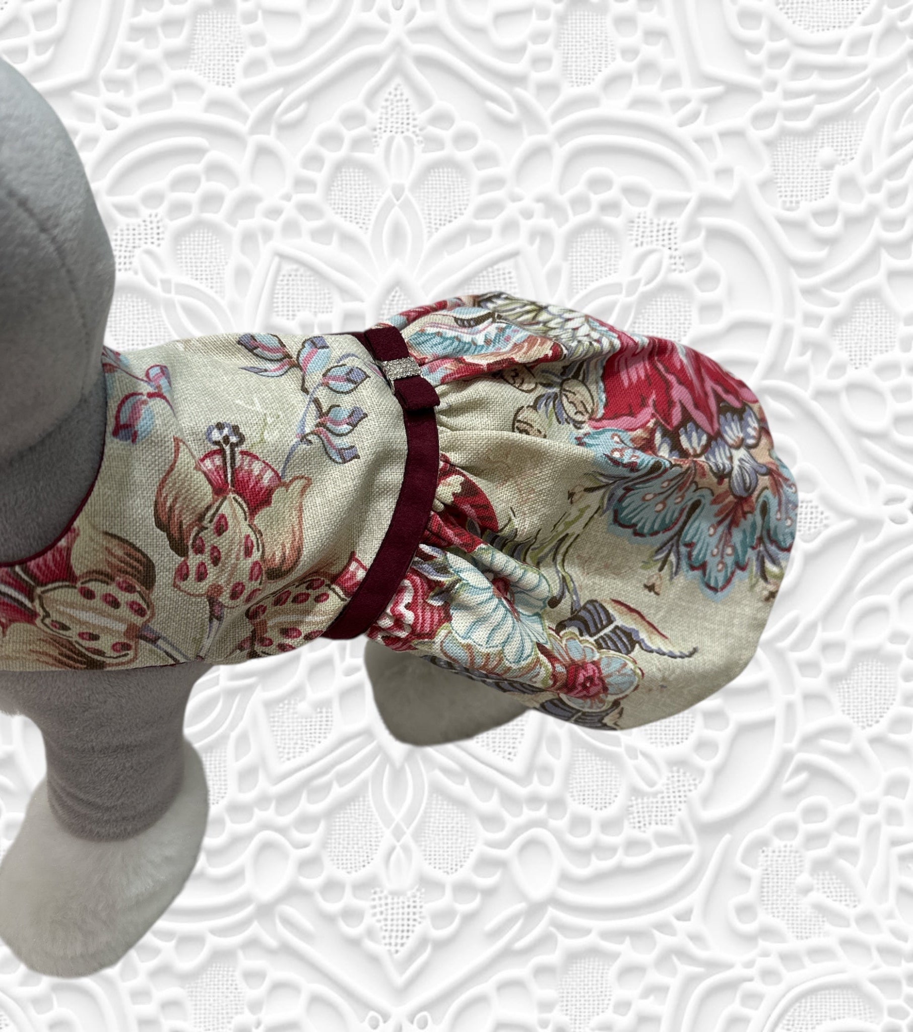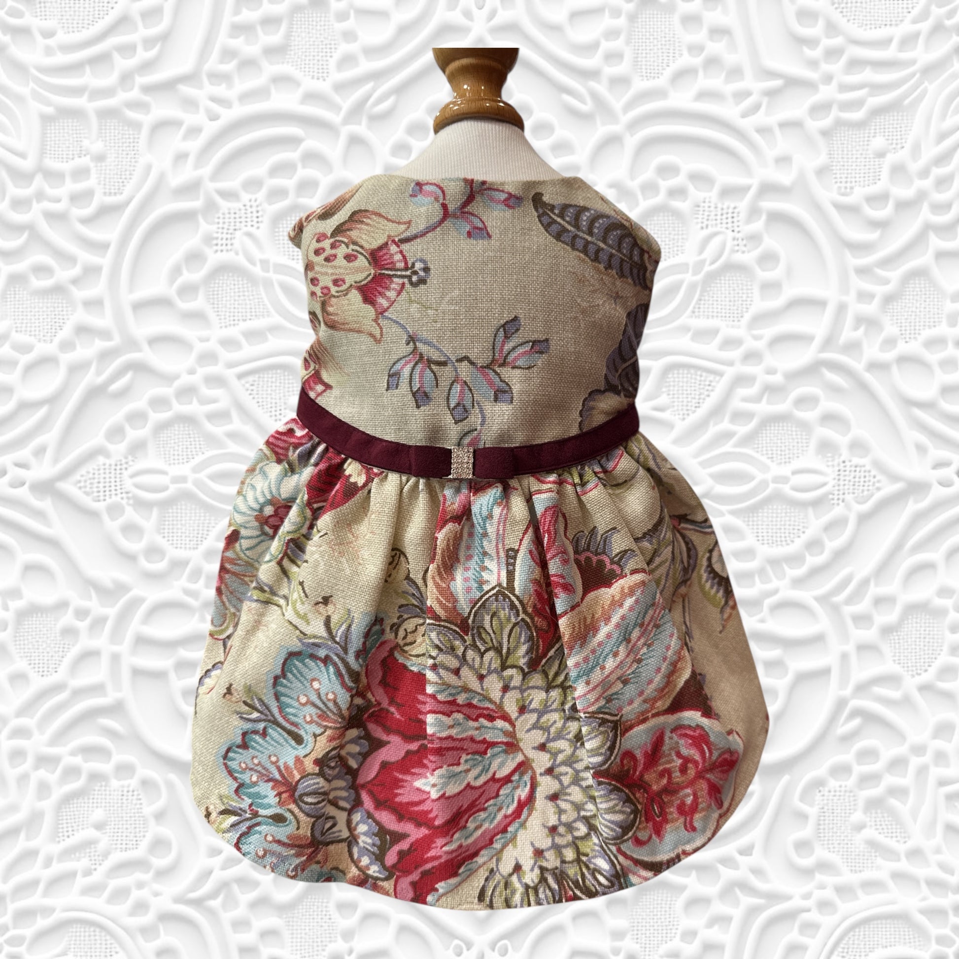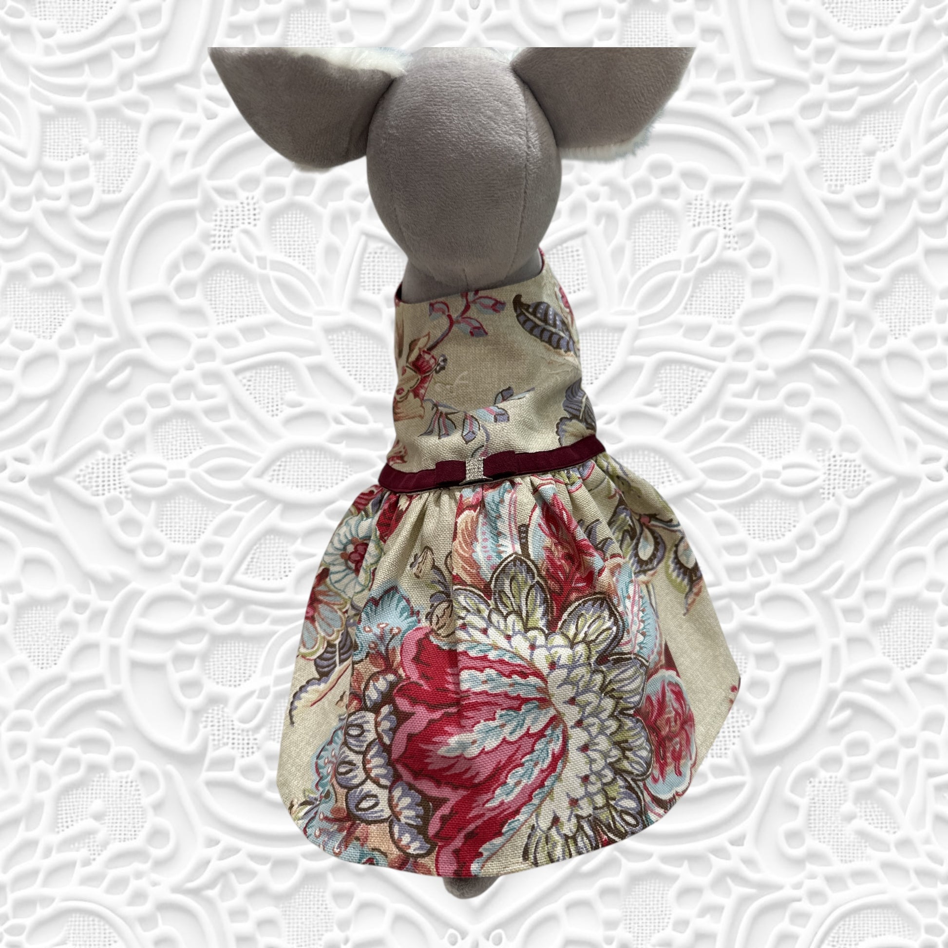 大柄な花柄のフランス生地で一着一着丁寧にハンドメイドされたワンピース。袖通しのきらいなワンちゃんでもボタン一つでおしゃれに大変身。