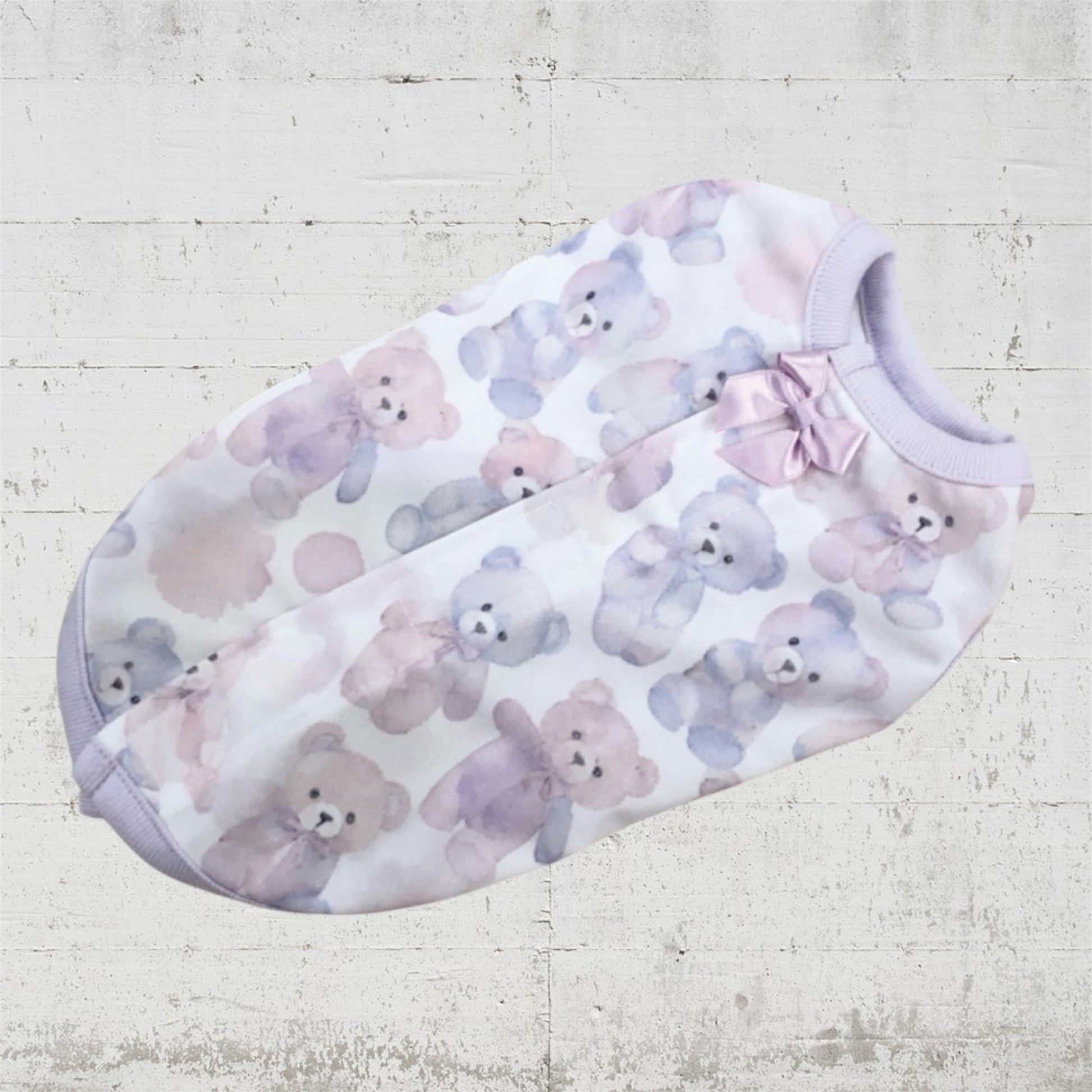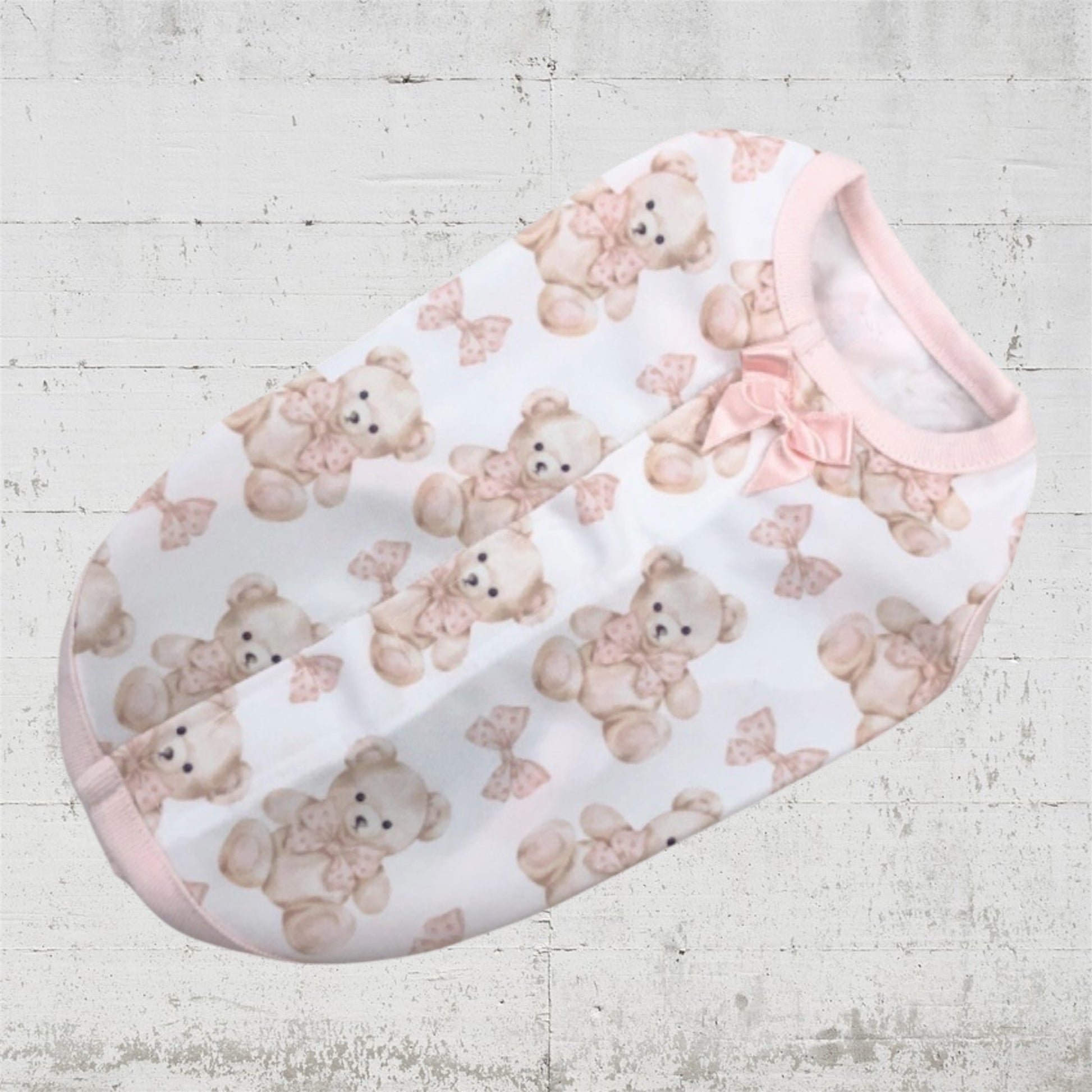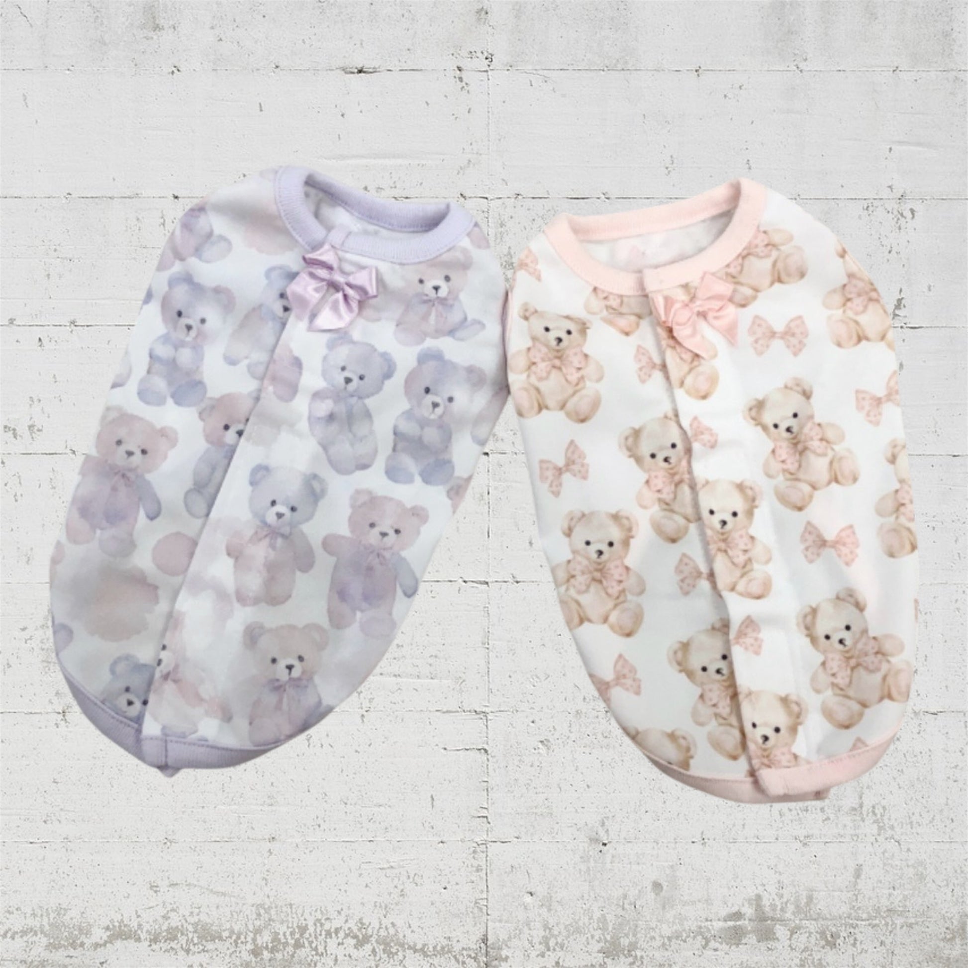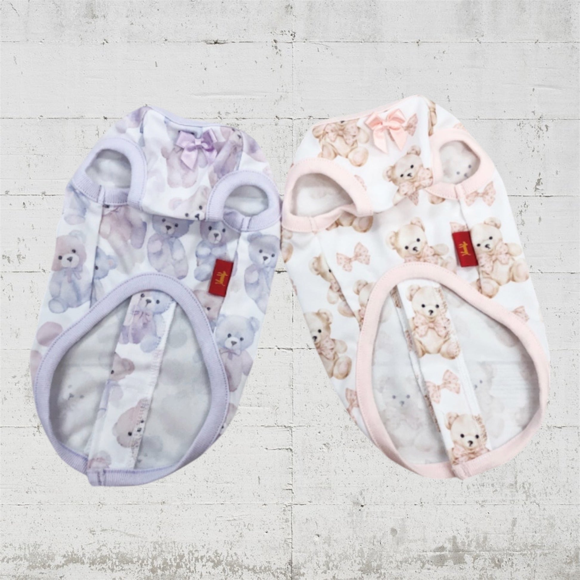 可愛いクマさん総柄の背中開きタンクトップ。マジックテープで全開するから着脱ラクチンです。