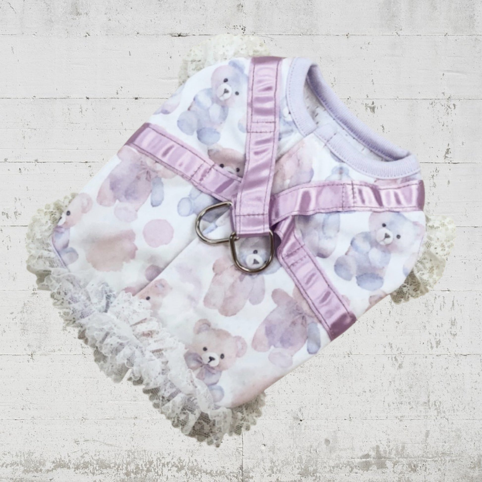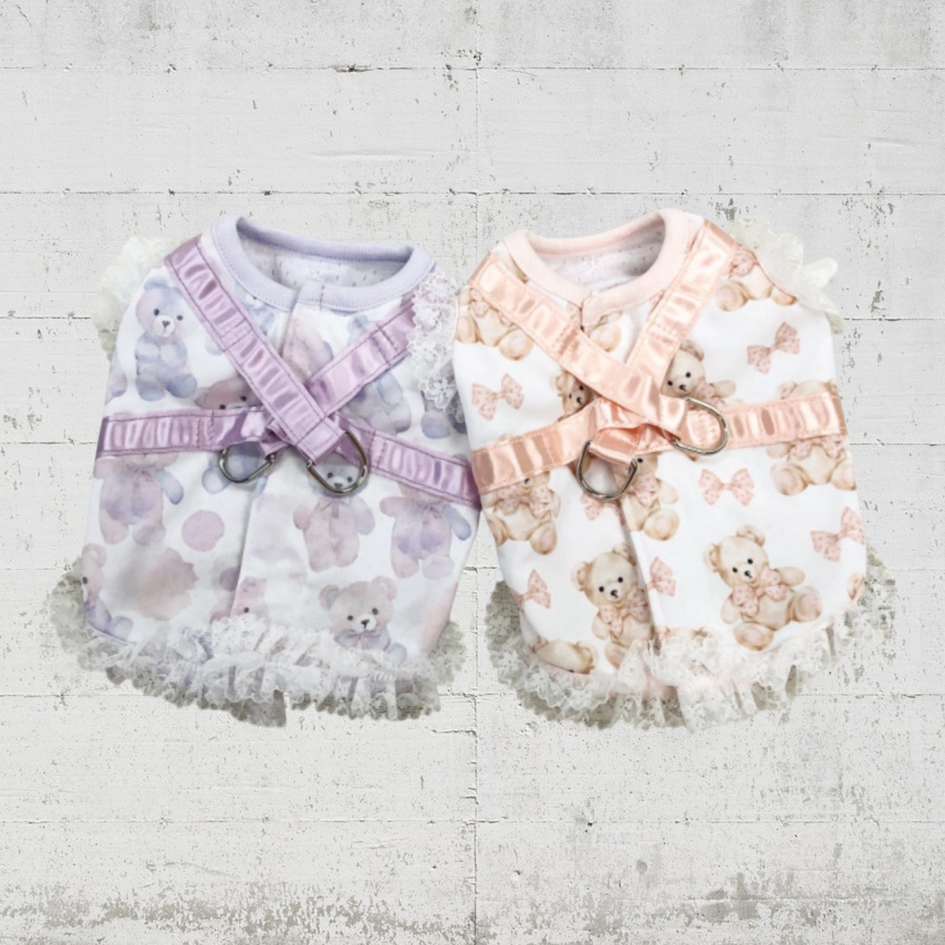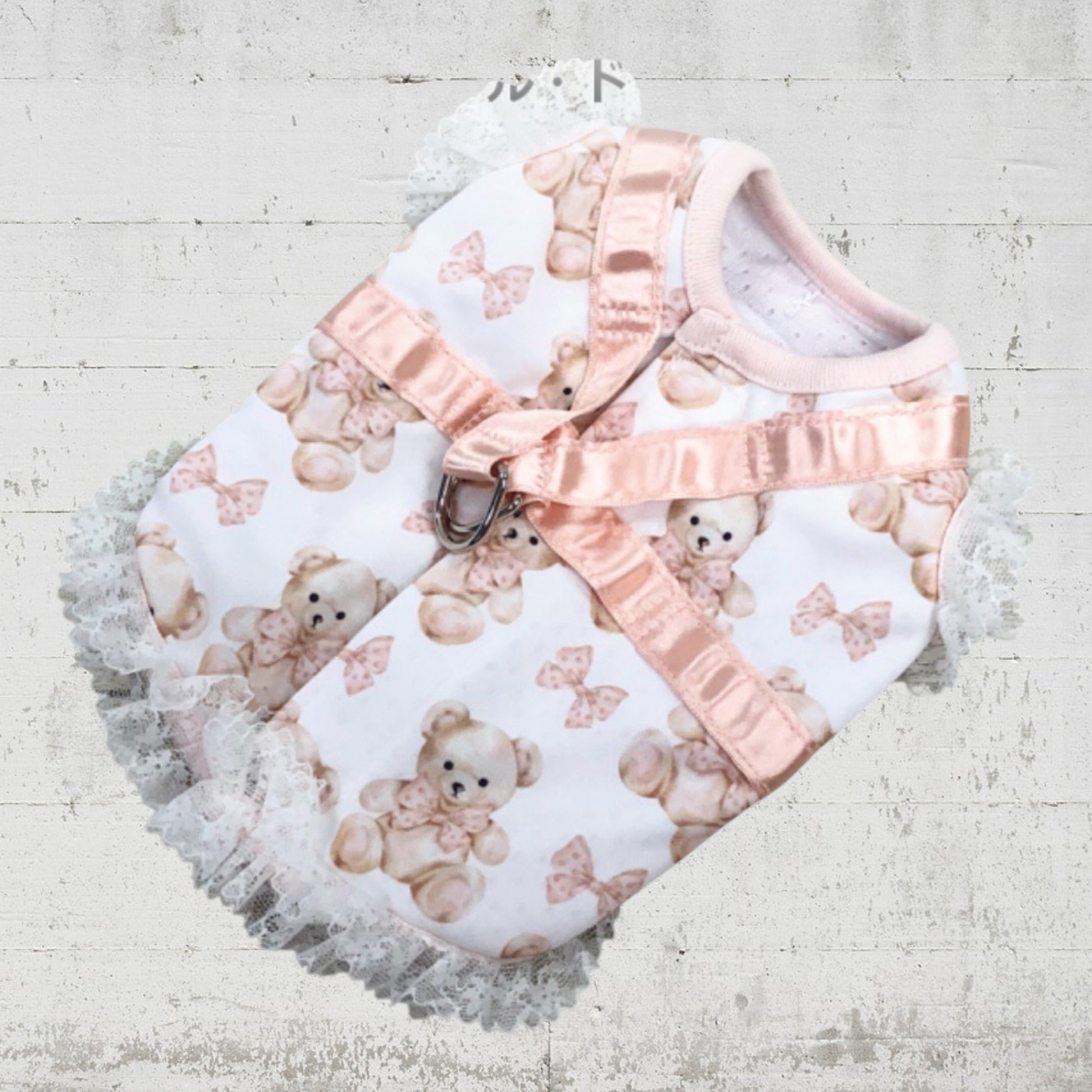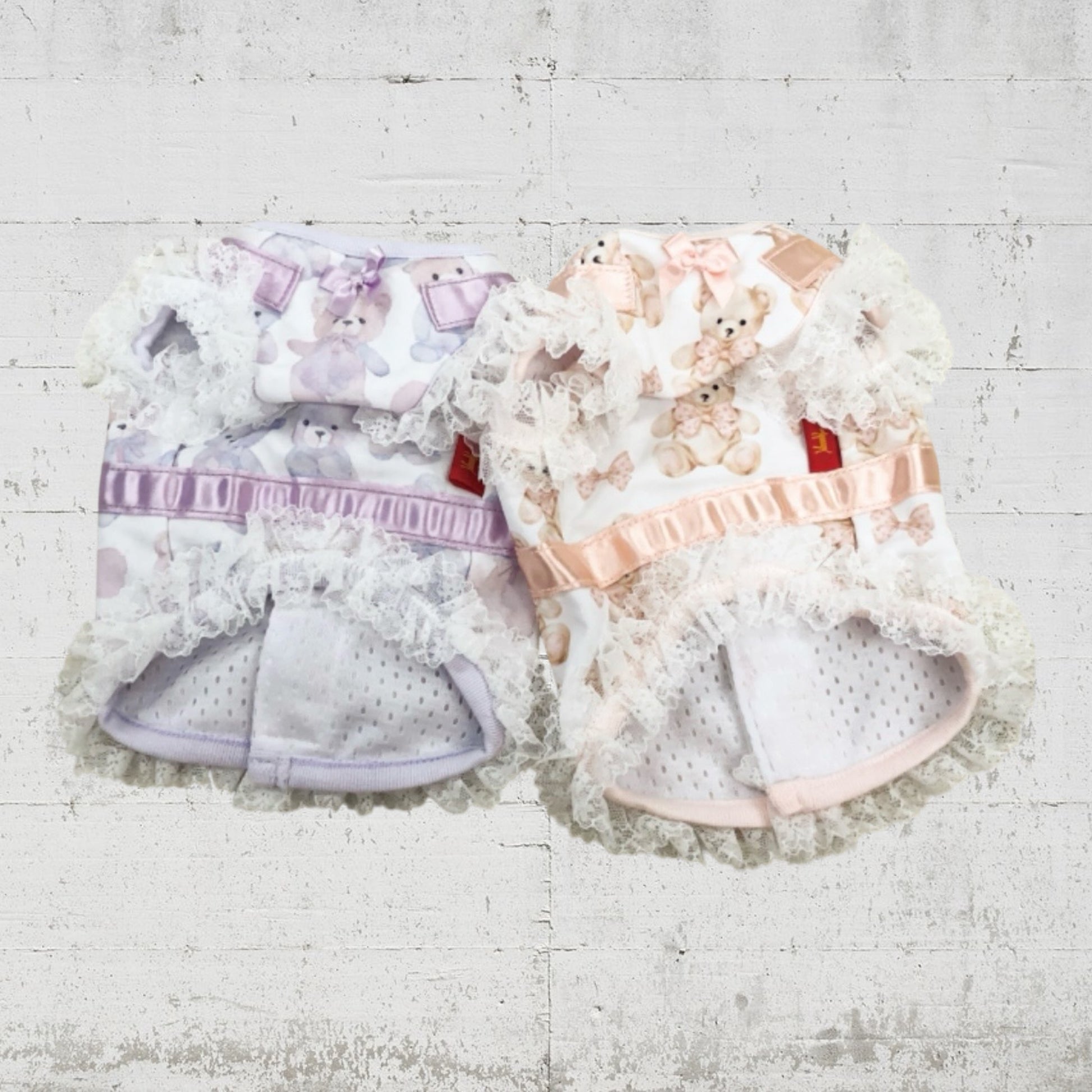 背中、前身頃両方ともスーパークール×クール生地使用。 内側はメッシュ生地で通気性もバツグン。 可愛いベア総柄のハーネスベスト。フリルもCUTEです!