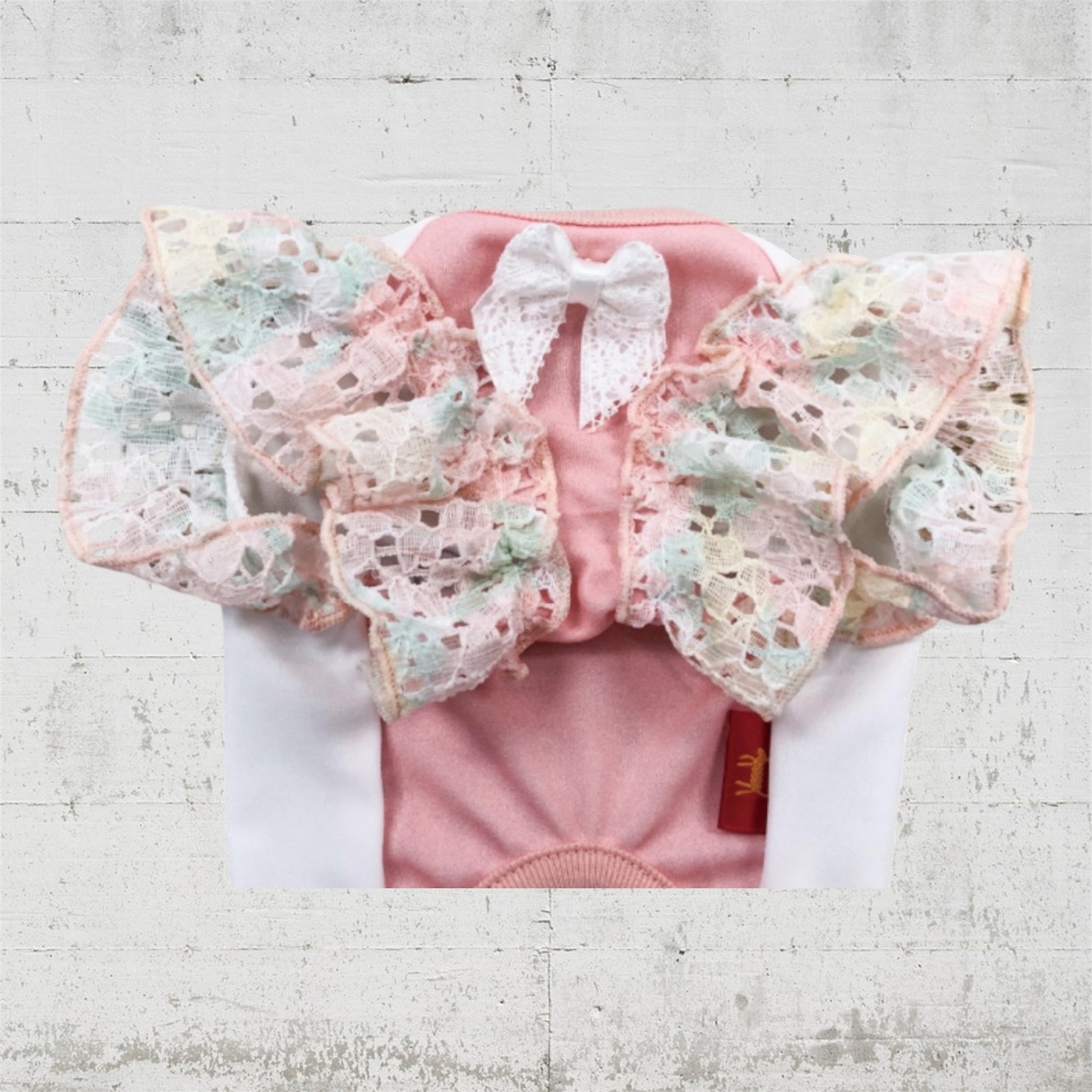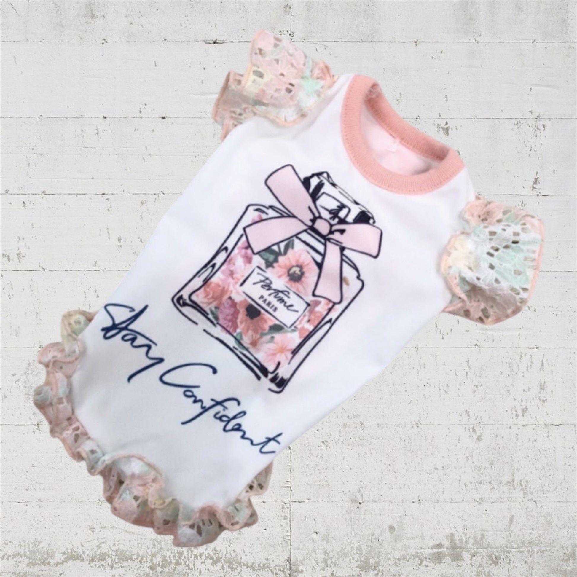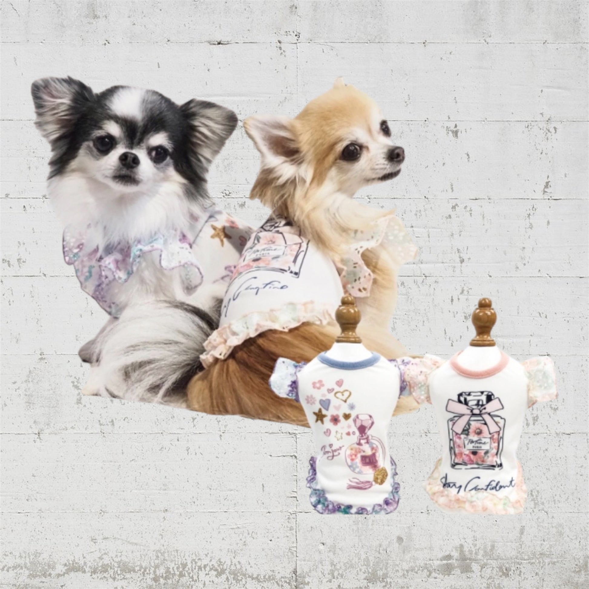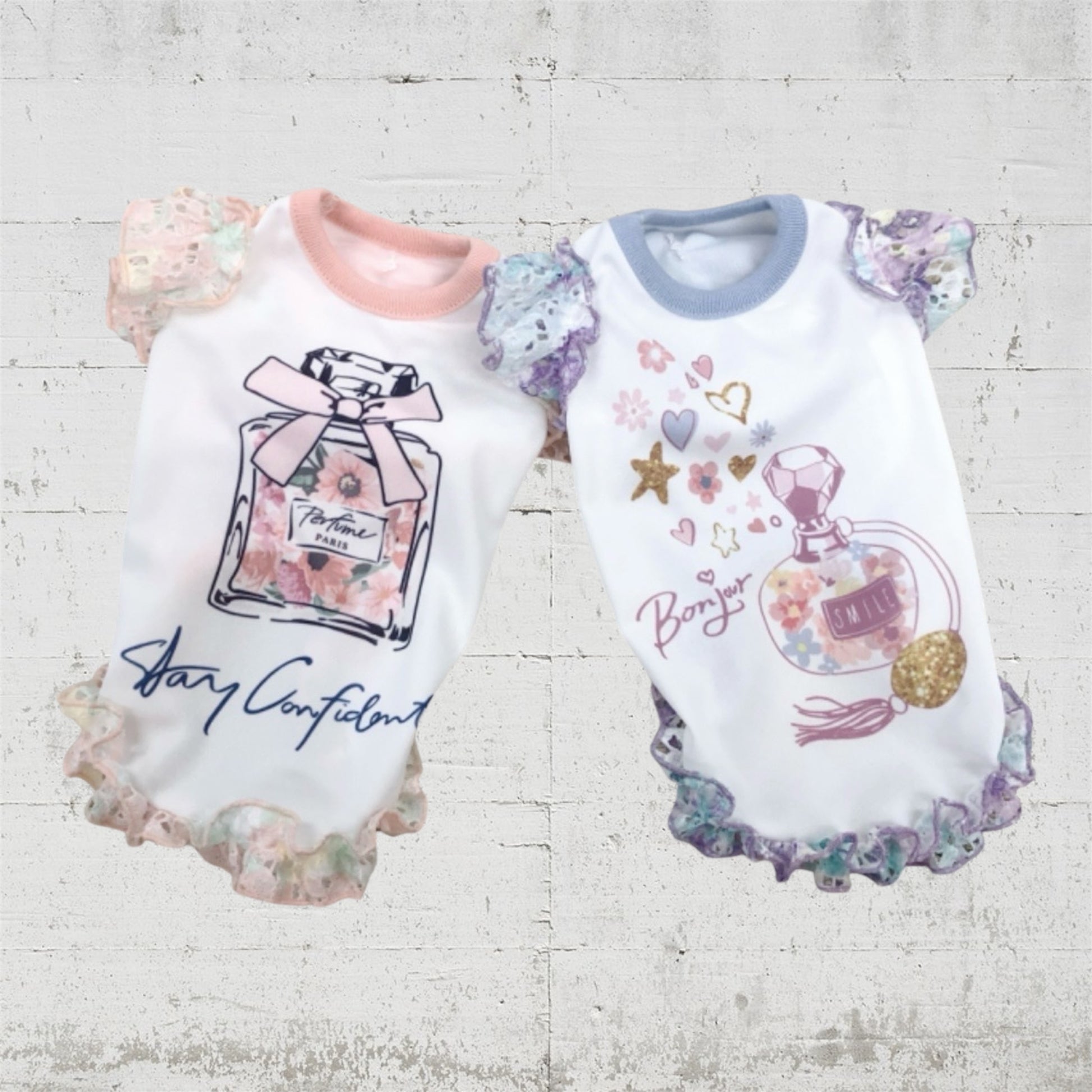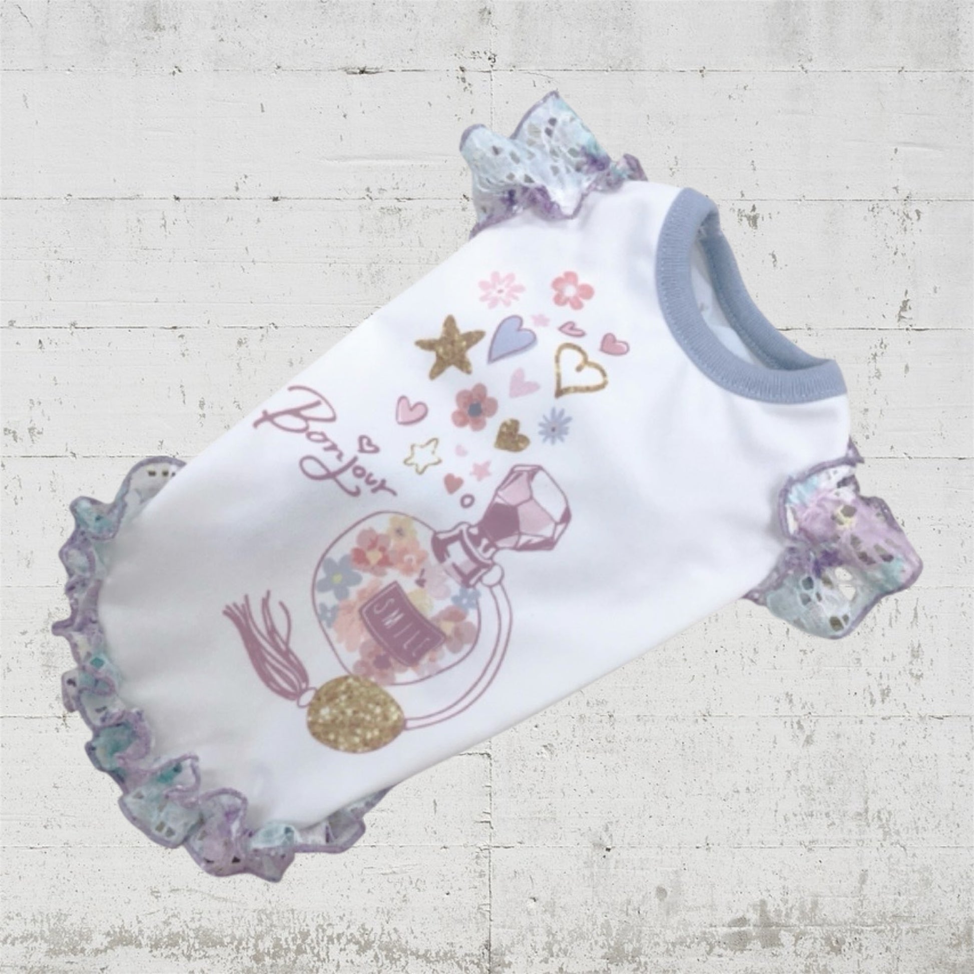「クール加工」「防虫加工」「UVカット加工」「抗菌・消臭加工」4つの機能が1枚に凝縮した「スーパークール×クール」。 背中、前身頃両方ともスーパークール×クール生地使用。 伸びが悪いので1サイズ上をお選びいただくことをおすすめいたします。 おしゃれな香水瓶のイラストを縁取るフリルが素敵です!