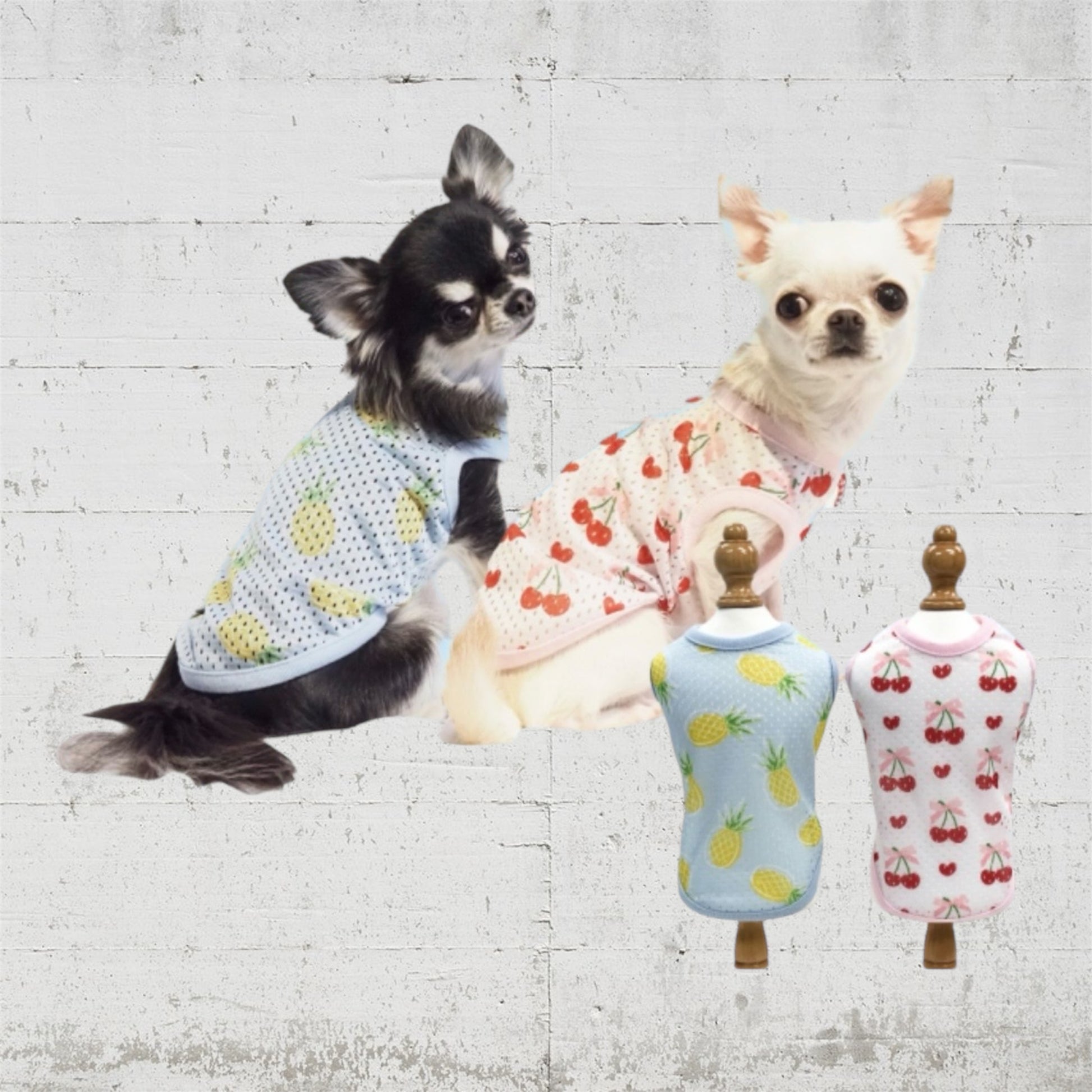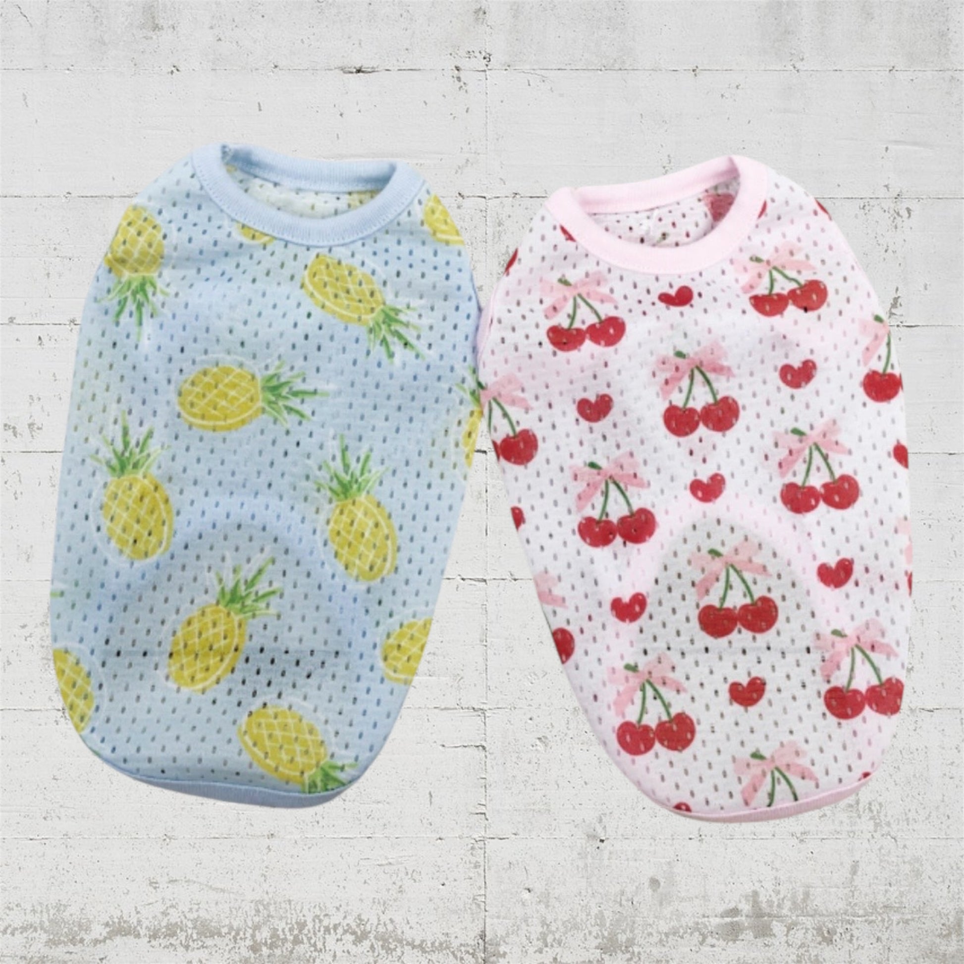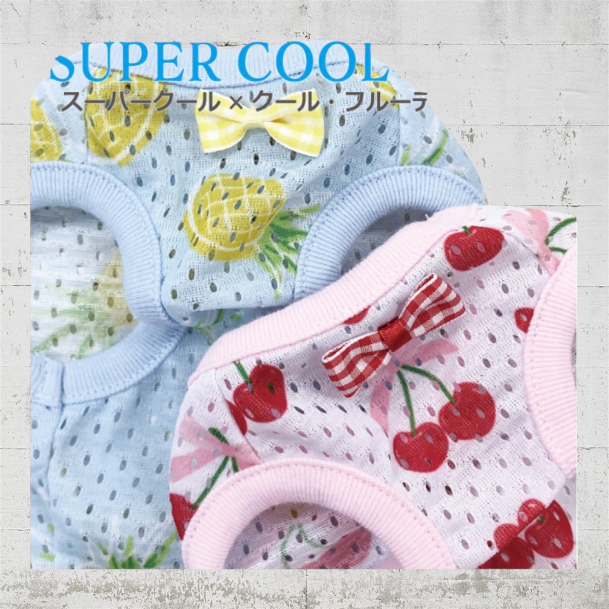 背中、前身頃両方ともスーパークール×クール生地使用。 内側はメッシュ生地で通気性もバツグン。 爽やかなフルーツプリントです。