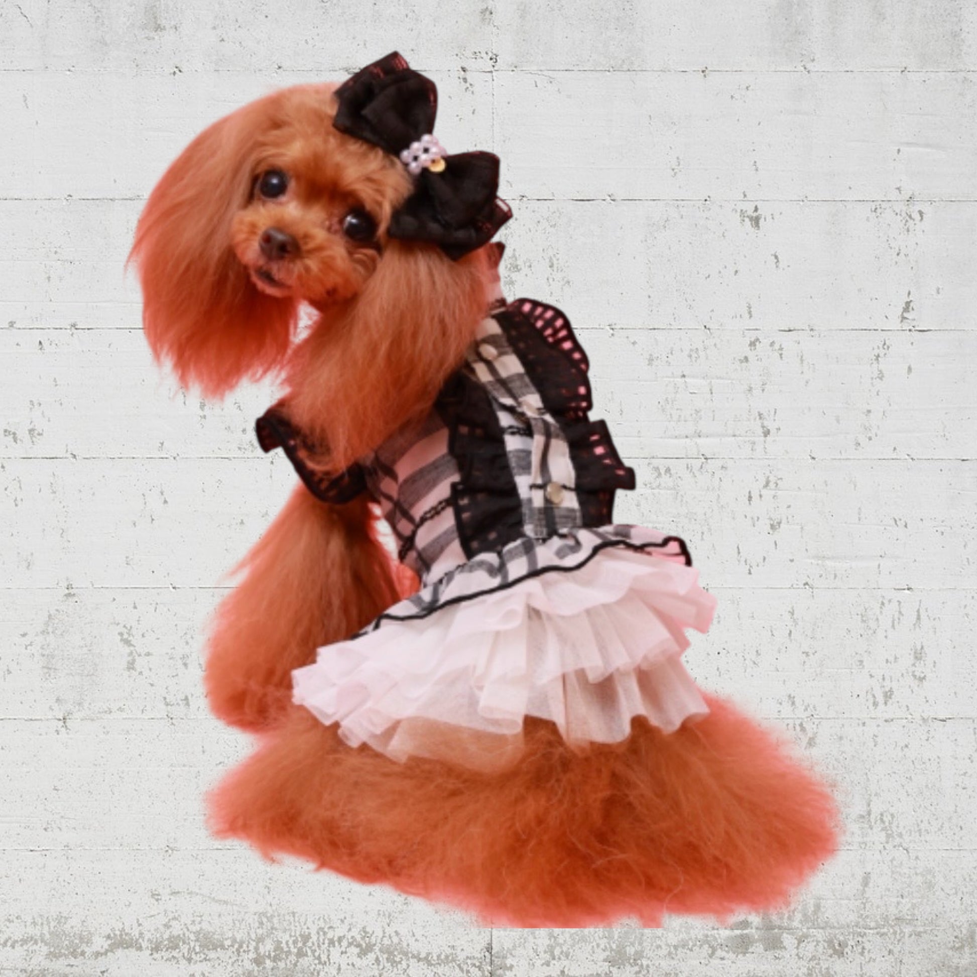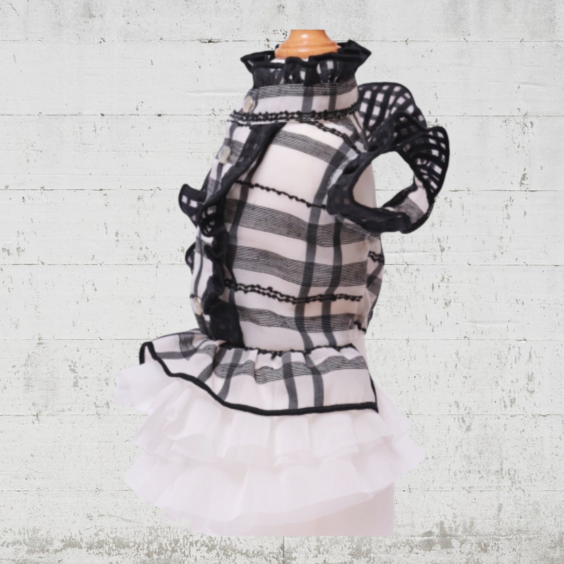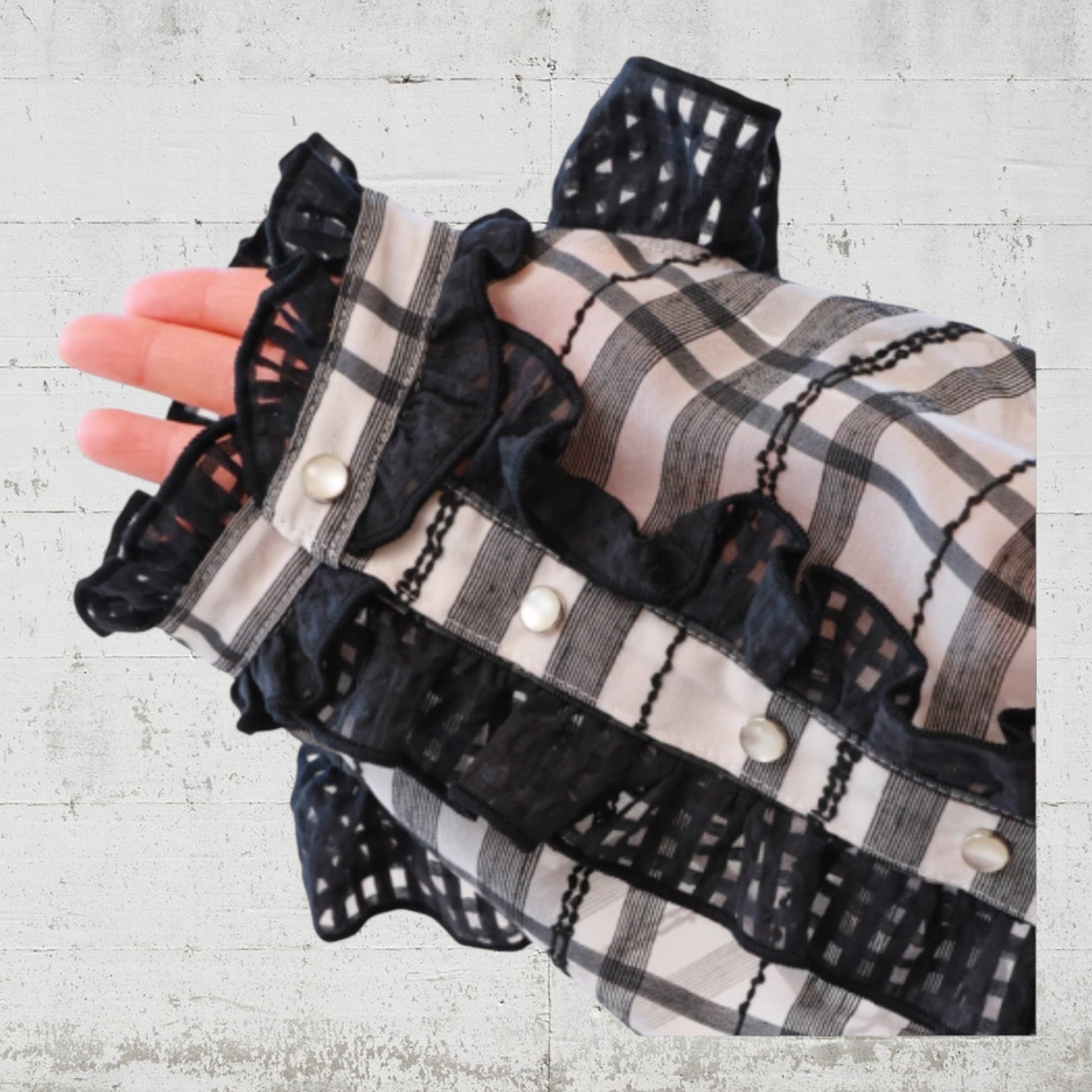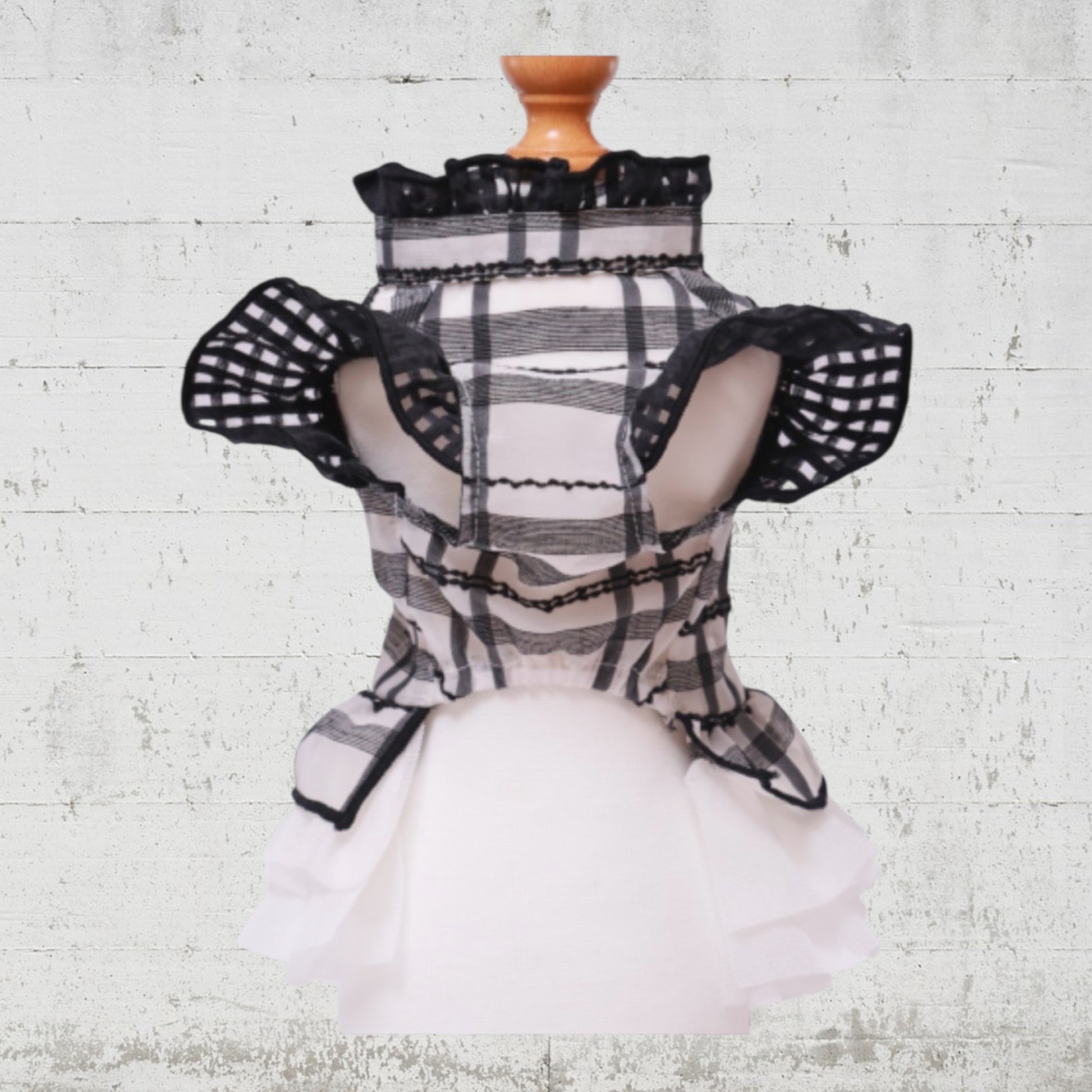 1枚でバッチリお写真映えをする華やかさ。今期は、さらっと涼しく着こなせる夏のモノトーンチェック。また透け感のある生地になりますので風通しも良く着ていただけます!