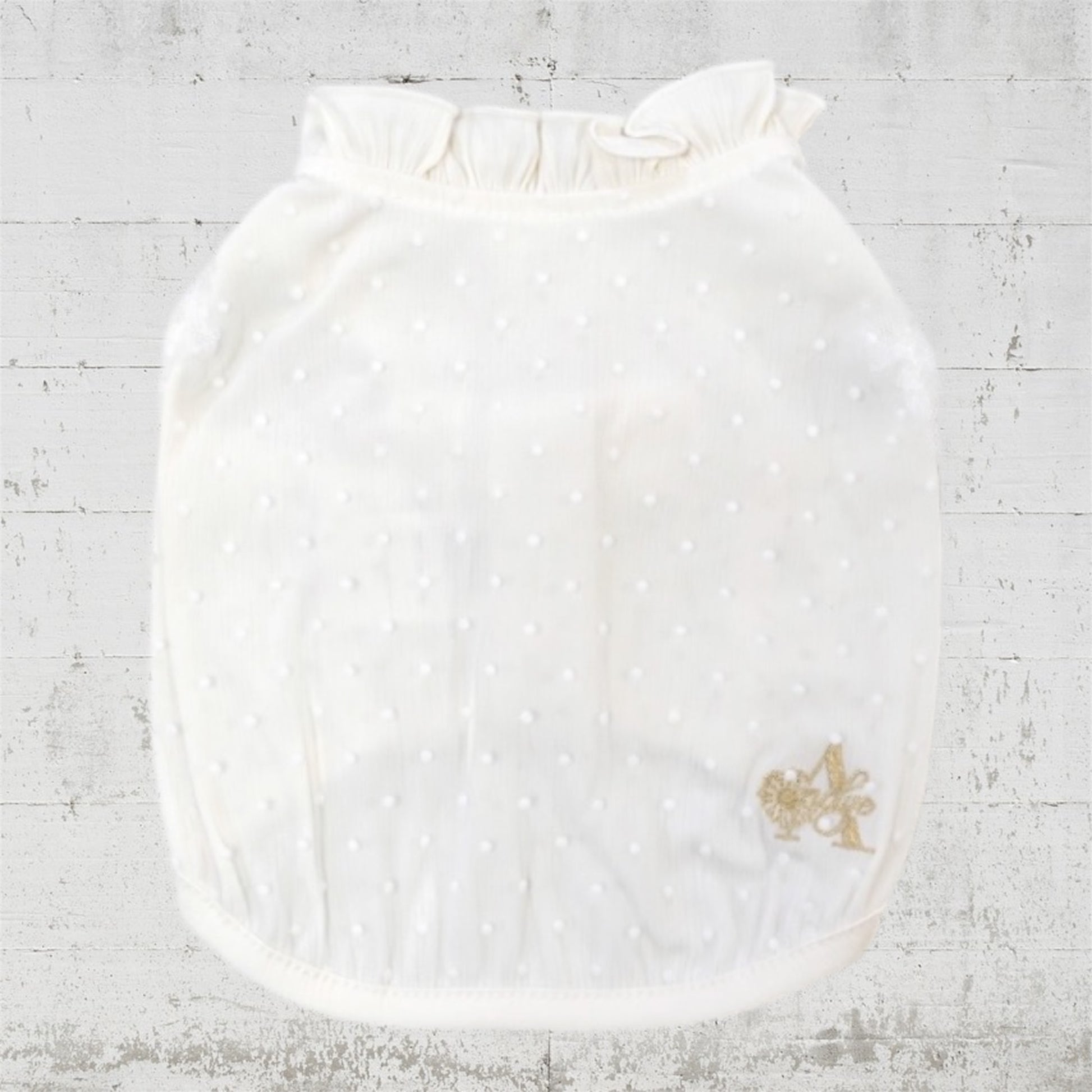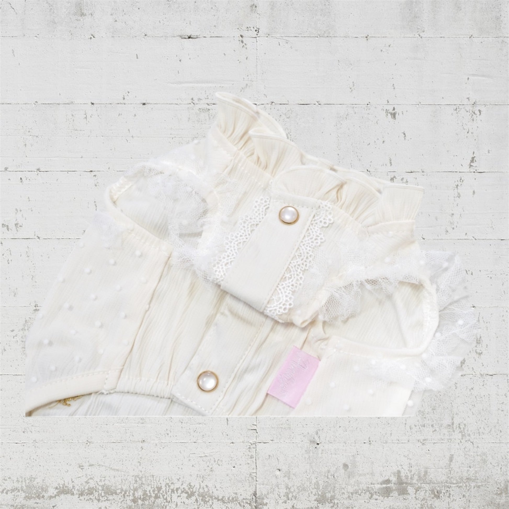ノースリーブながら、ドットチュールをジグザグに叩きつけたレースを裁断して、袖周りに使用することでニュアンスな味わい仕様にしました。