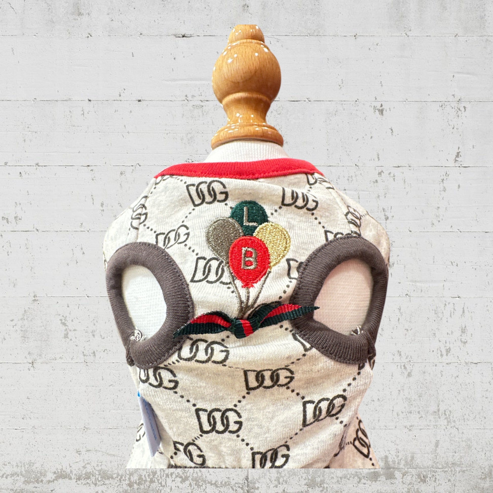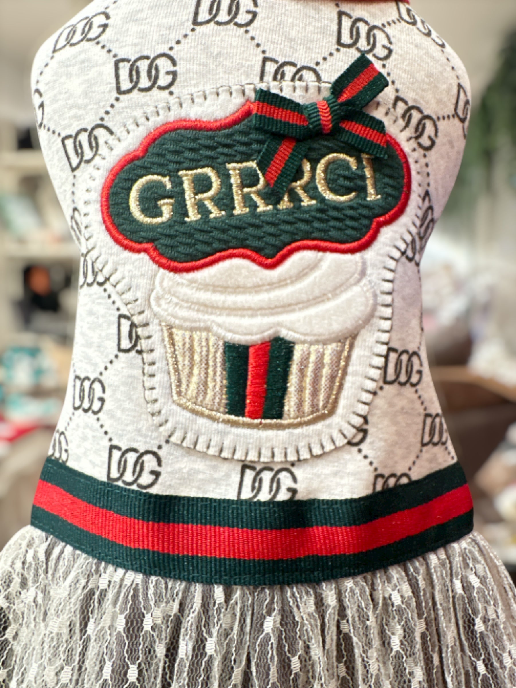 モノグラム柄にカップケーキが刺繍されたかわいいワンピースです。