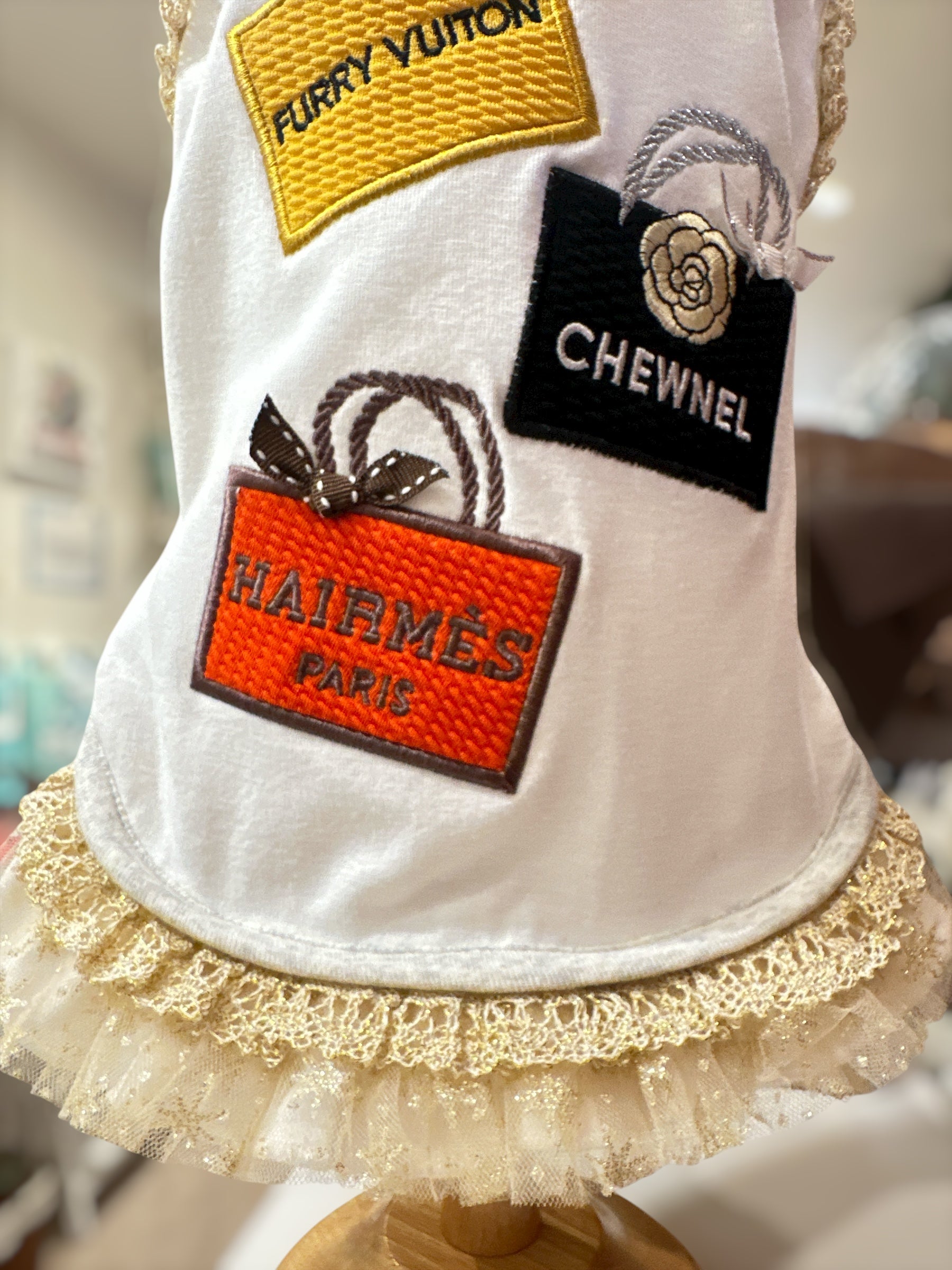 ルナブルーの全てのショップバッグが刺繍されているタンクトップ。肩にはボタンが縫い付けてあり高級感満載です。