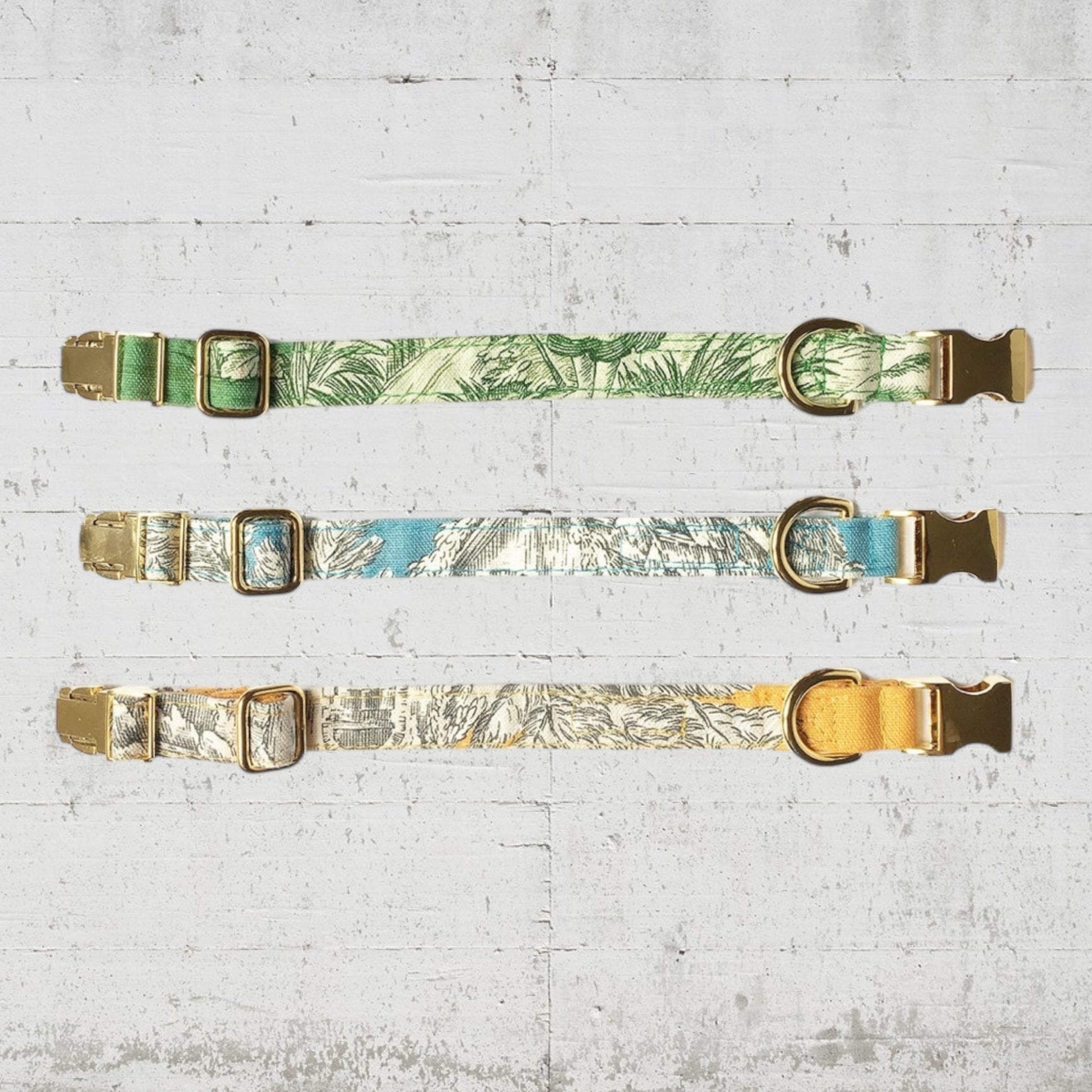 フランスの風景画生地が全面にあしらわれたフレンシシックなベイサージュカラー。ゴールドメタリックのバックルはわんちゃんを素敵にみせてくれるだけでなく、耐久性と強度に優れており、安全にお使い頂けます。お揃いのリードと合わせればさらに素敵になります。