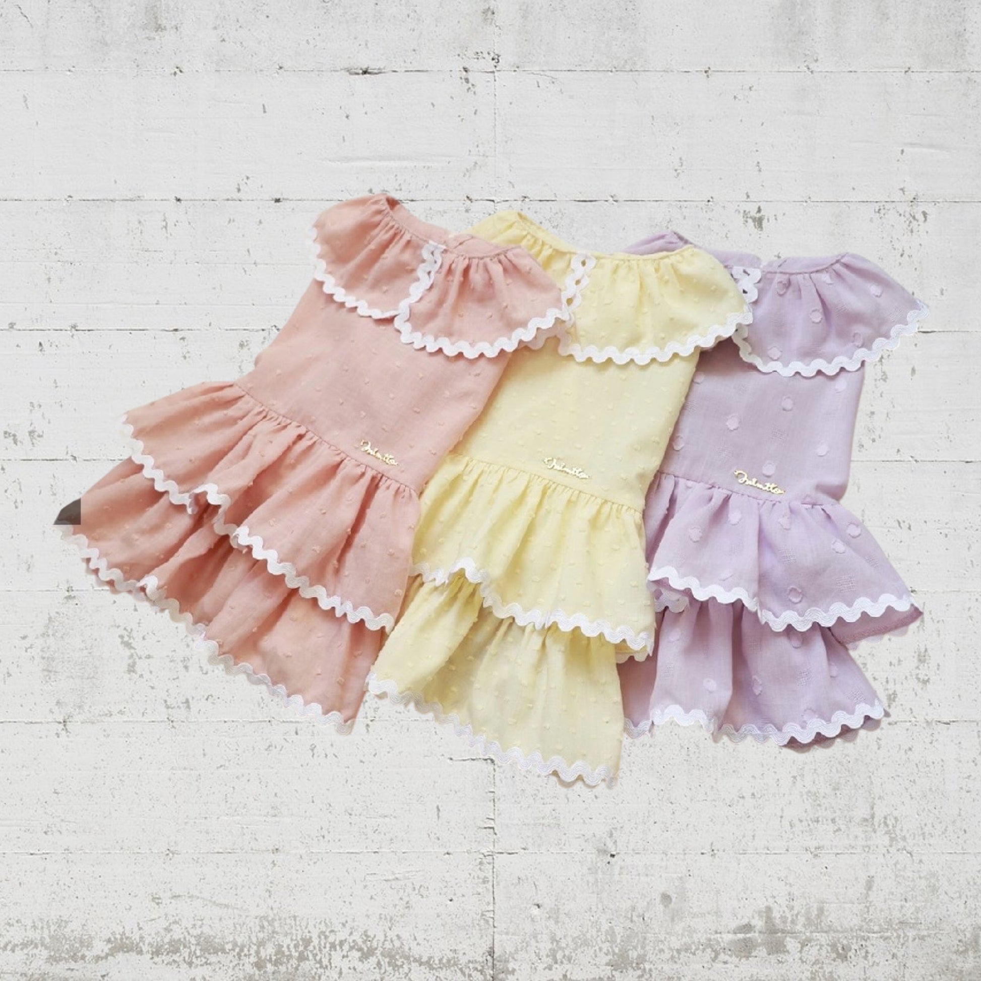 パステルカラーにドット刺繍が可愛いワンピース。甘すぎず上品な色みとデザイン。薄手のブラウス生地でさらっときれて涼しく過ごせます。