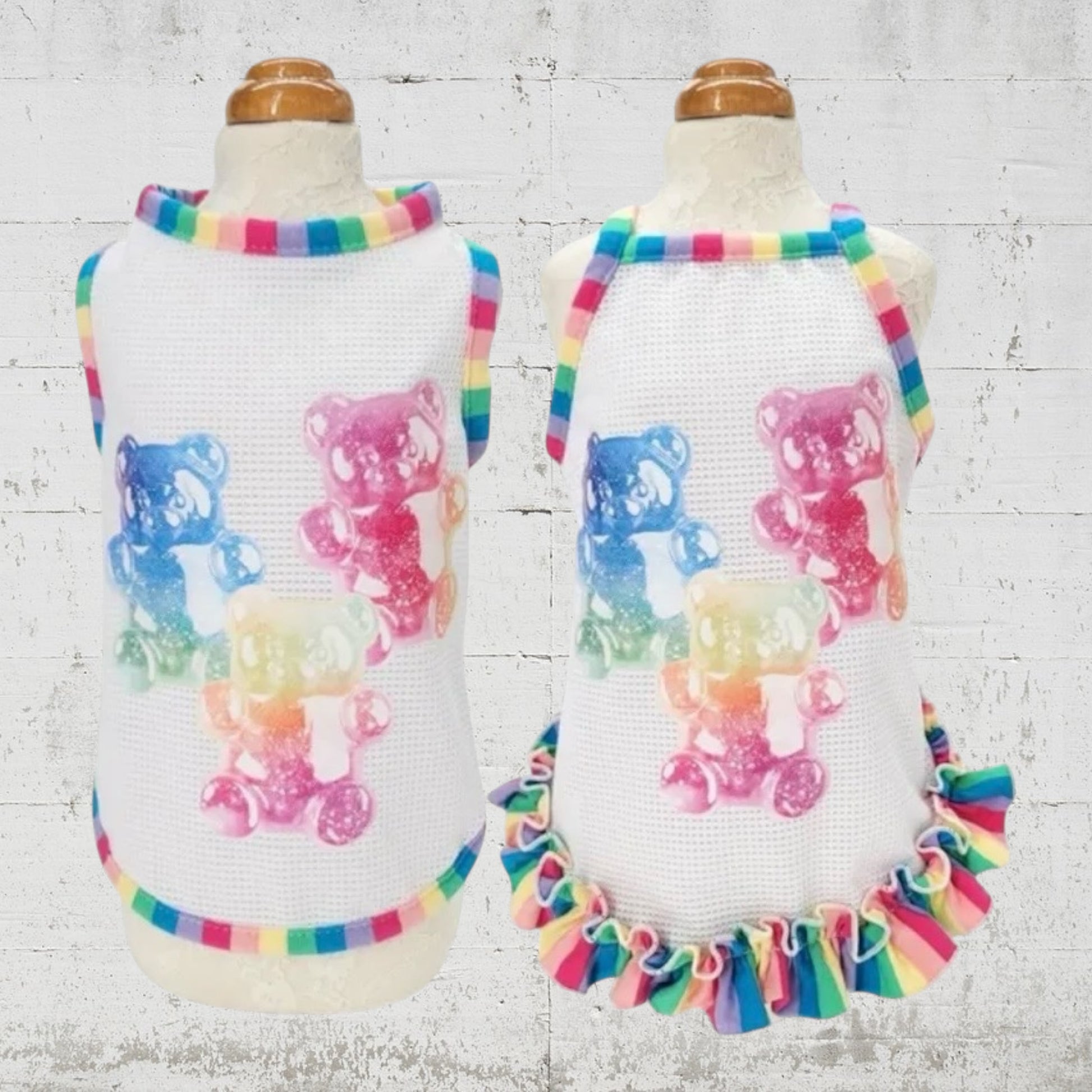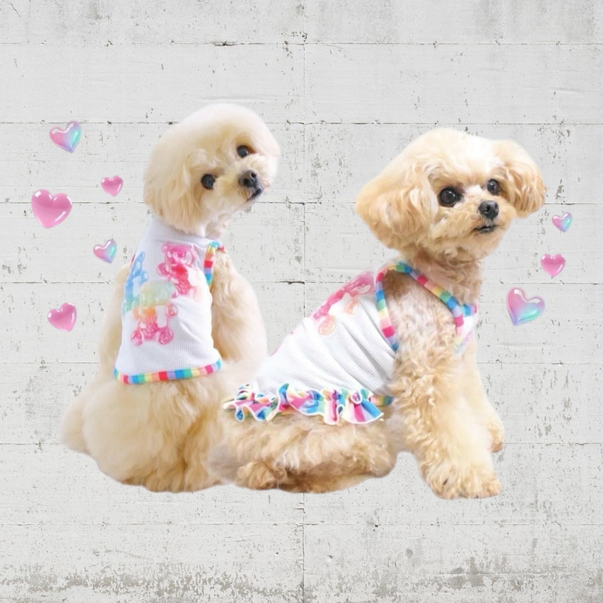 暑いシーズンに重宝する涼感加工のメッシュウェア。ぷるんとしたジェリーベアのプリントと、カラフルボーダー使いがPOP。フロントのハートプリントにPVCでジェリーベアを閉じ込めちゃいました。OPの裾のフリルがぷりぷりなのもキュート🩷